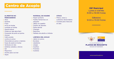 Rosarito, B.C. En solidaridad con las víctimas de los terremotos ocurridos el jueves 7 y martes 19 de septiembre en la zona sur y centro del país, respectivamente, el Gobierno Municipal invita a la población a donar alimentos, materiales de higiene, limpieza y otros utensilios para los damnificados, acudiendo al Centro de Acopio instalado en las oficinas del DIF Municipal.